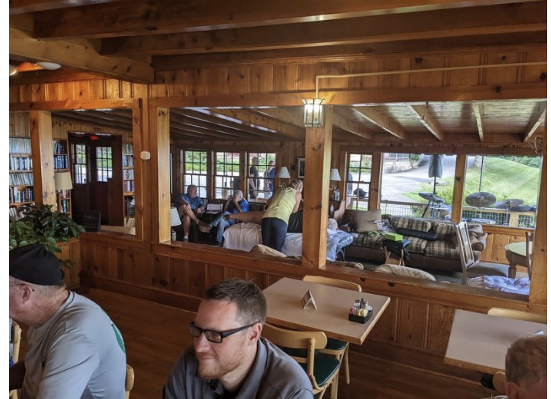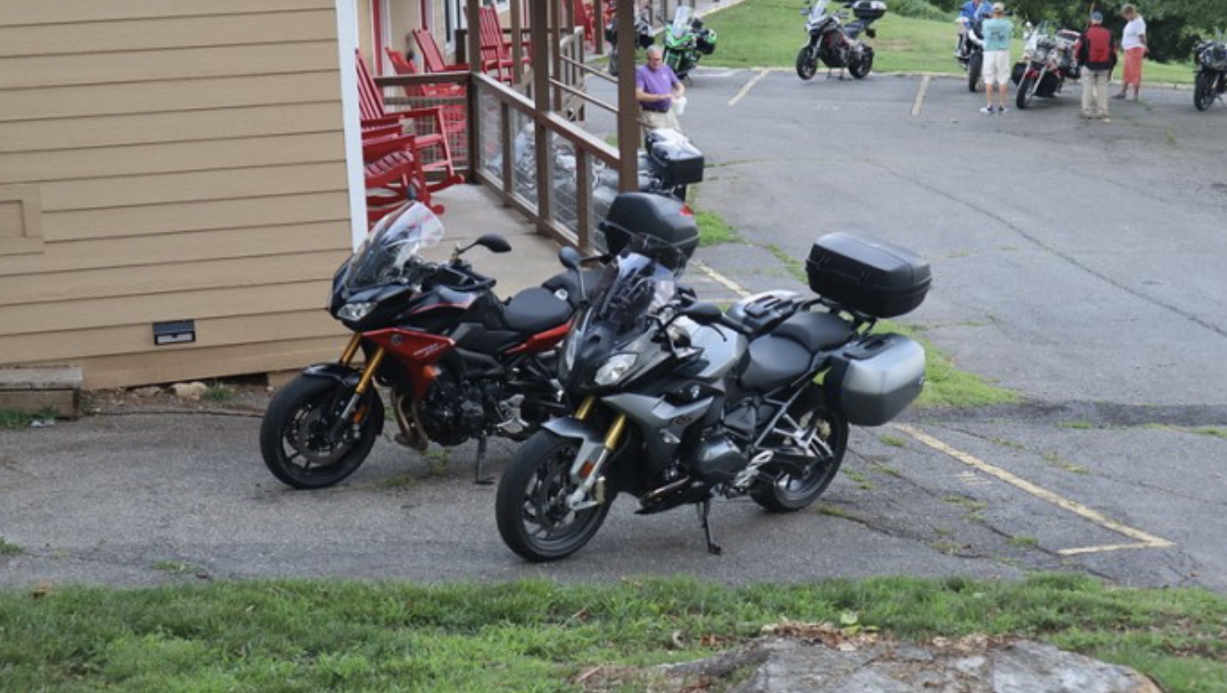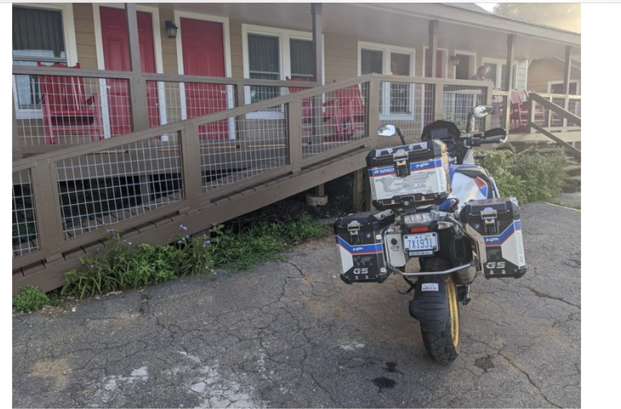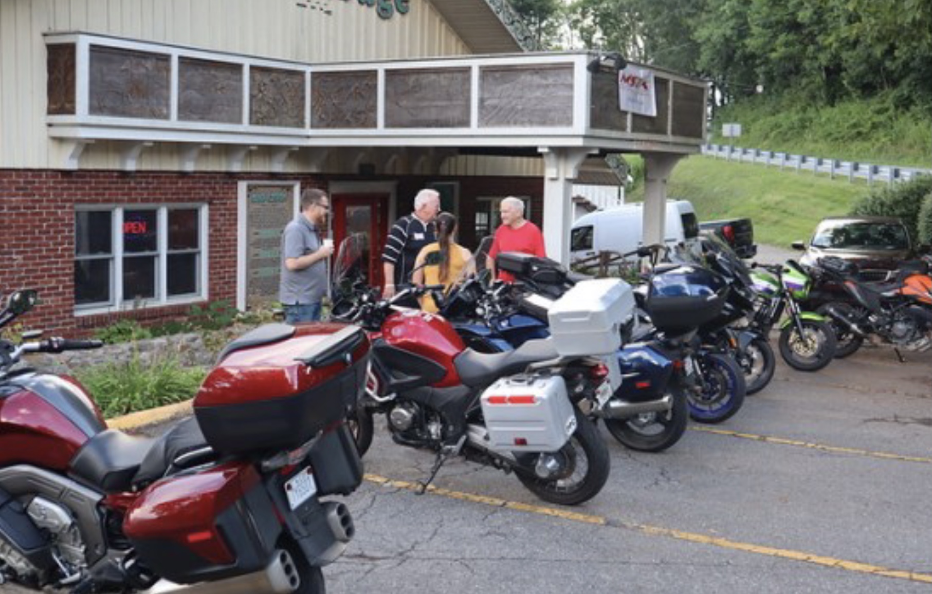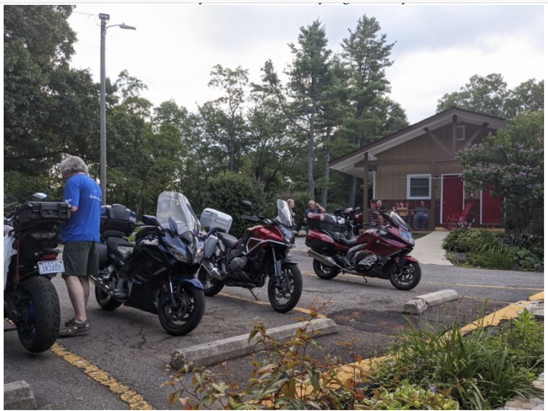 It is a long drive to Little Switzerland NC, however, the good news was we made it without any sort of issue. One of the highlights of this rally is getting away from the heat. Triple digits were the norm at home, so rolling into the Big Lynn Lodge to temps in the low 80s was wonderful. We unload the bikes and get checked into the rooms, before making our way to the lobby for dinner.
