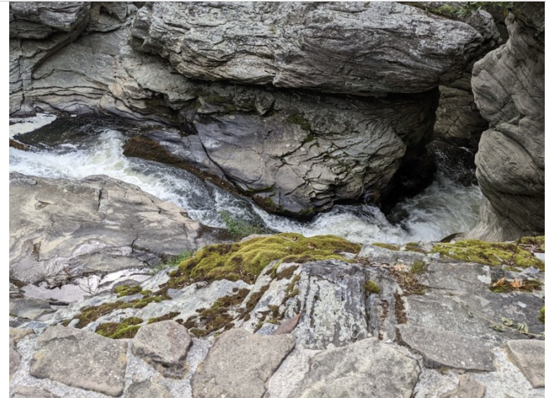 Looking down at the rushing water.