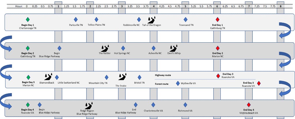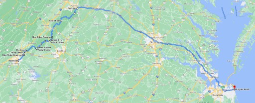 Day 4 – Blue Ridge Parkway Roanoke VA 314 6h 6m Virginia Beach VA