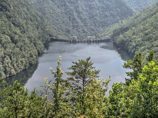 The Calderwood Dam and Lake Calderwood viewed from the Tail of The Dragon overlook. Photo by Dsdugan, Wikimedia CC.