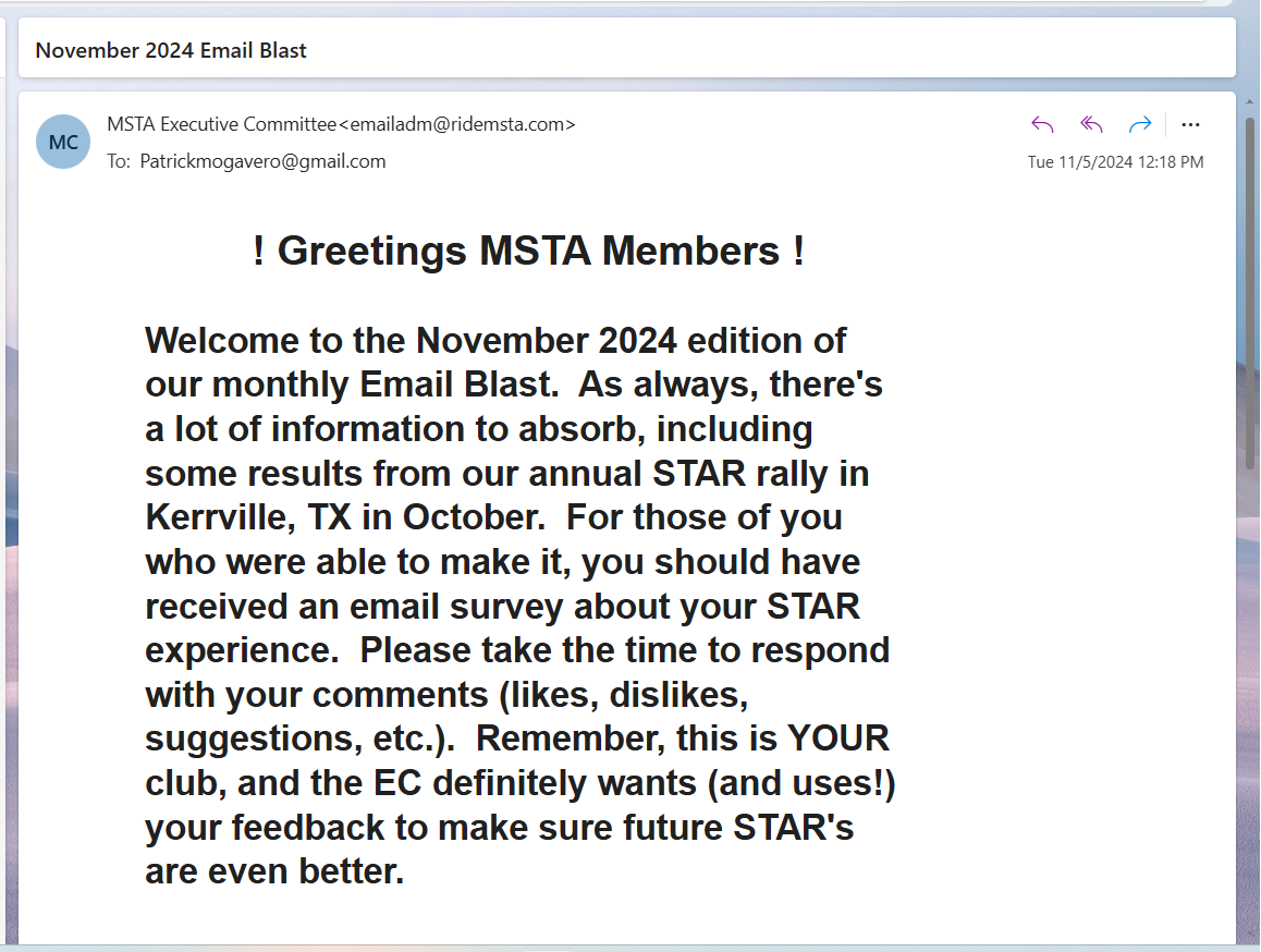 It has been said that almost every problem we face can be traced back to one core cause…. lack of good communication. This might be especially true when dealing with groups of any size over one. The MSTA is no stranger to this and over the years we have developed many ways that we communicate between members, between the leaders and the members, between areas of the country, and even from the club to non-members.