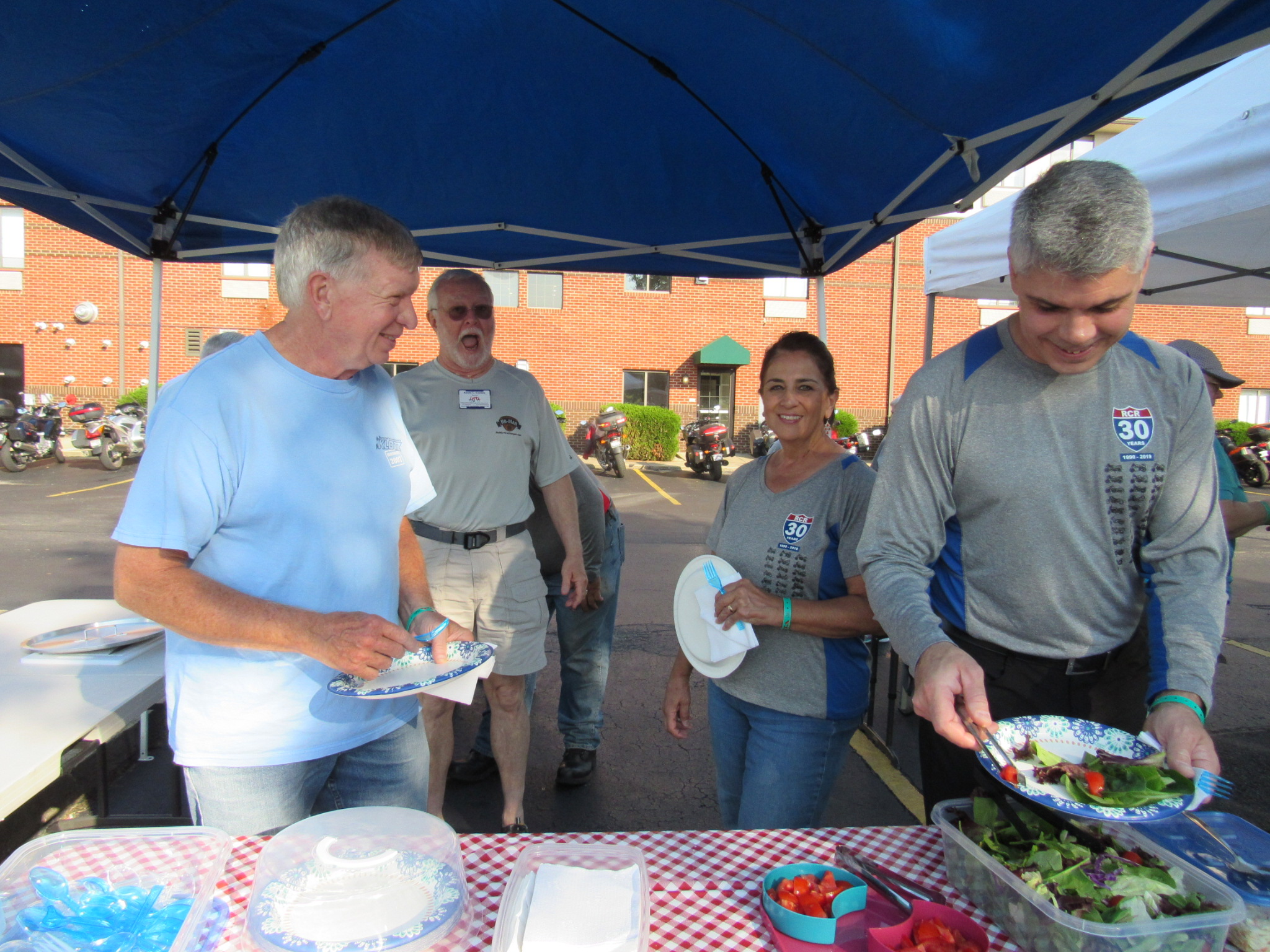 After a shower, a change, and some rehydration, it was time for dinner. By this time almost all of the other attendees had she on up and the parking lot was filled with bikes. I counted 72 different bikes, and there were all kinds there….lots and lots of sportbikes and sport-touring bikes, cruisers from HD and Indian, a couple of dual sports, and even 3 CanAms. We all sat down under the tents provided by the hotel, at the tables provided by them as well. And enjoyed a cookout provided by and prepared by various members….a big tip of the hat here to Geoffrey Greene, who took on the task of organizing and hosting the event this year….GREAT JOB!! After dinner, there was a whole more rehydration and storytelling going on, discussions and comments on bikes, rides, roads, and of course, tires. Several hours later everyone was in their rooms sleeping and dreaming of even more riding to be done on Saturday.