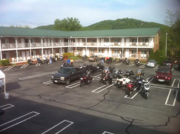 “This past Thursday I met my pal, Luis, in Butler Kentucky around 9:30. We then rode our bikes (he on a VFR, me on my FZ6) to Sparta, NC. We used almost all backroads, and along the way rode through the Red River Gorge area, Whitesburg, Ky (with a stop at the Mountain Mist Moonshine store to pick up a shirt), through Virginia on “The Crooked Road”, and various other backroads to Sparta. We arrived about 7pm and found already about 15 other bikes there….even though the rally runs Friday through Sunday, “officially “. After unpacking the bikes and getting something cold to drink, we accompanied a couple of other attendees…Jon and Woovis…on a walk downtown to a local BBQ place for dinner. After dinner we walked back to the hotel and joined several other members in a general bull session until well after dark. It’s at times like this that introductions are made, new friendships are formed, and riding plans for the next day are decided upon. The cool of the evening.