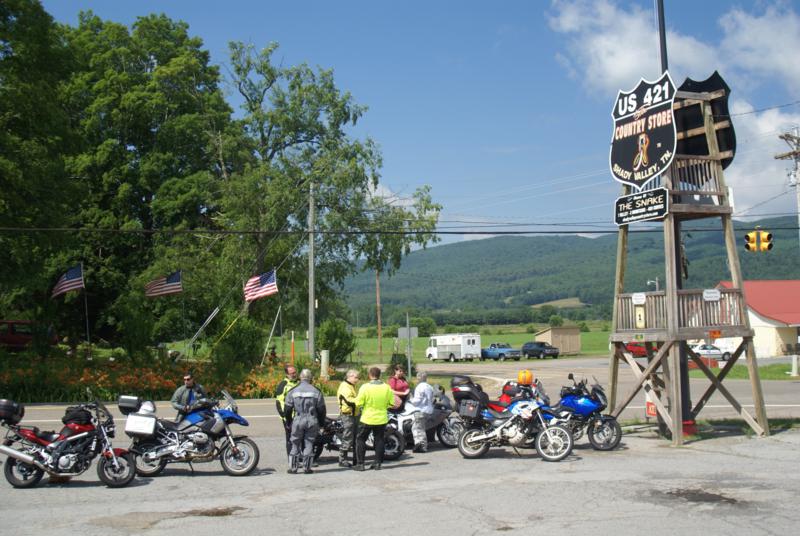 “This past Thursday I met my pal, Luis, in Butler Kentucky around 9:30. We then rode our bikes (he on a VFR, me on my FZ6) to Sparta, NC. We used almost all backroads, and along the way rode through the Red River Gorge area, Whitesburg, Ky (with a stop at the Mountain Mist Moonshine store to pick up a shirt), through Virginia on “The Crooked Road”, and various other backroads to Sparta. We arrived about 7pm and found already about 15 other bikes there….even though the rally runs Friday through Sunday, “officially “. After unpacking the bikes and getting something cold to drink, we accompanied a couple of other attendees…Jon and Woovis…on a walk downtown to a local BBQ place for dinner. After dinner we walked back to the hotel and joined several other members in a general bull session until well after dark. It’s at times like this that introductions are made, new friendships are formed, and riding plans for the next day are decided upon. The cool of the evening.