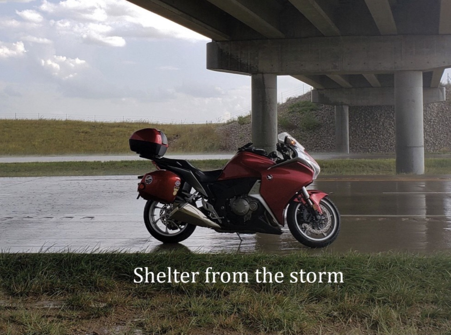 Once the rain let up, I opted for a motel in the first town I came to. That turned out to be a desirable choice. With the rain still coming down, I was allowed to pull The Viffer under the overhang and out of the rain.