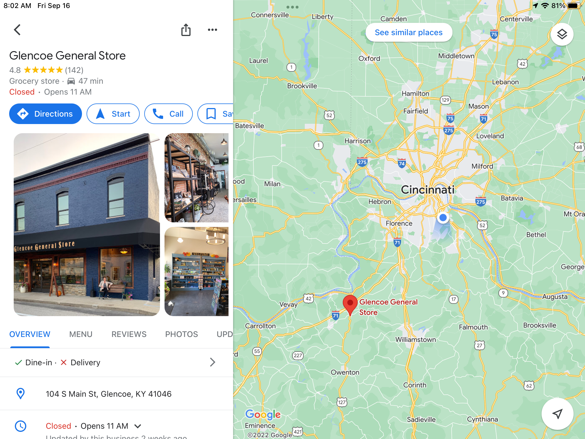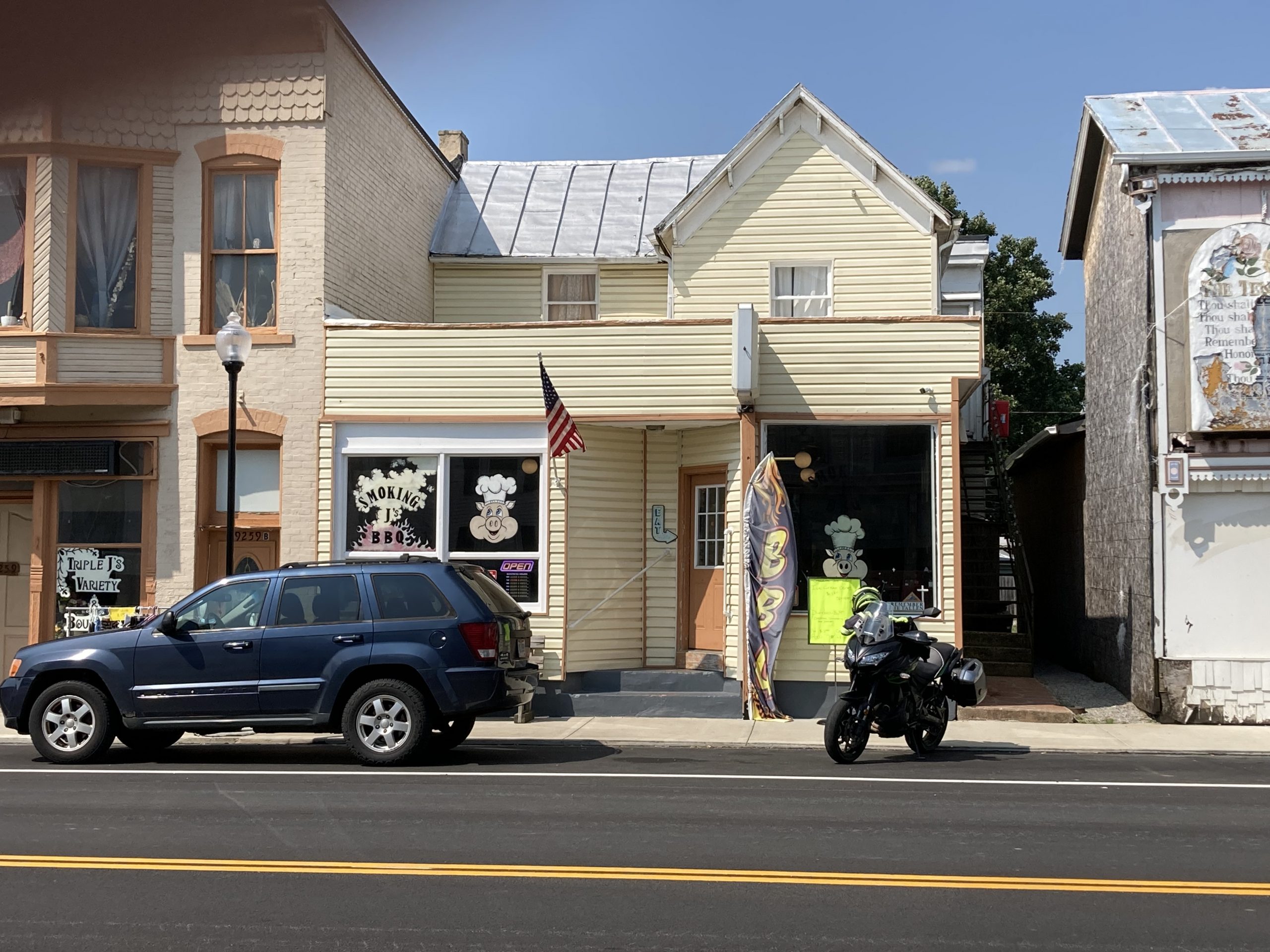 But the reason I was there was to eat, right? So how was the food, you ask? In a word, delicious. I opted for a cheeseburger, with lettuce and tomato, alongside a small order of fries. Topped it off with a can of Pepsi. The burger patty itself was huge, and I am very glad that I didn’t go for the double! The lettuce and tomato had that fresh, home-grown flavor and crispness to them. The portion of fries was also quite big and no need to order the large. They were done to perfection. Crispy but not hard, with just the right amount of seasoning. One of the best hamburgers and fries I’ve had anywhere. The cost for my lunch? $11.00 plus a small tip. I ordered at the counter, grabbed a can of Pepsi from the cooler, sat down, and they brought my burger and fries to me at my table. I didn’t have to wait long, but it was definitely cooked to order and not just sitting there waiting for me. Nothing “fast food” about it. The Store is well known for its wood-fired pizza but has a full menu of sandwiches and other items to go along with the pizza. They hold a farmers’ market in the parking lot on Saturday mornings and often have live entertainment outside on Saturday evenings. Glencoe is a very small town located southwest of Cincinnati at the intersection of routes 467 and 27. Lots of good riding in the area.