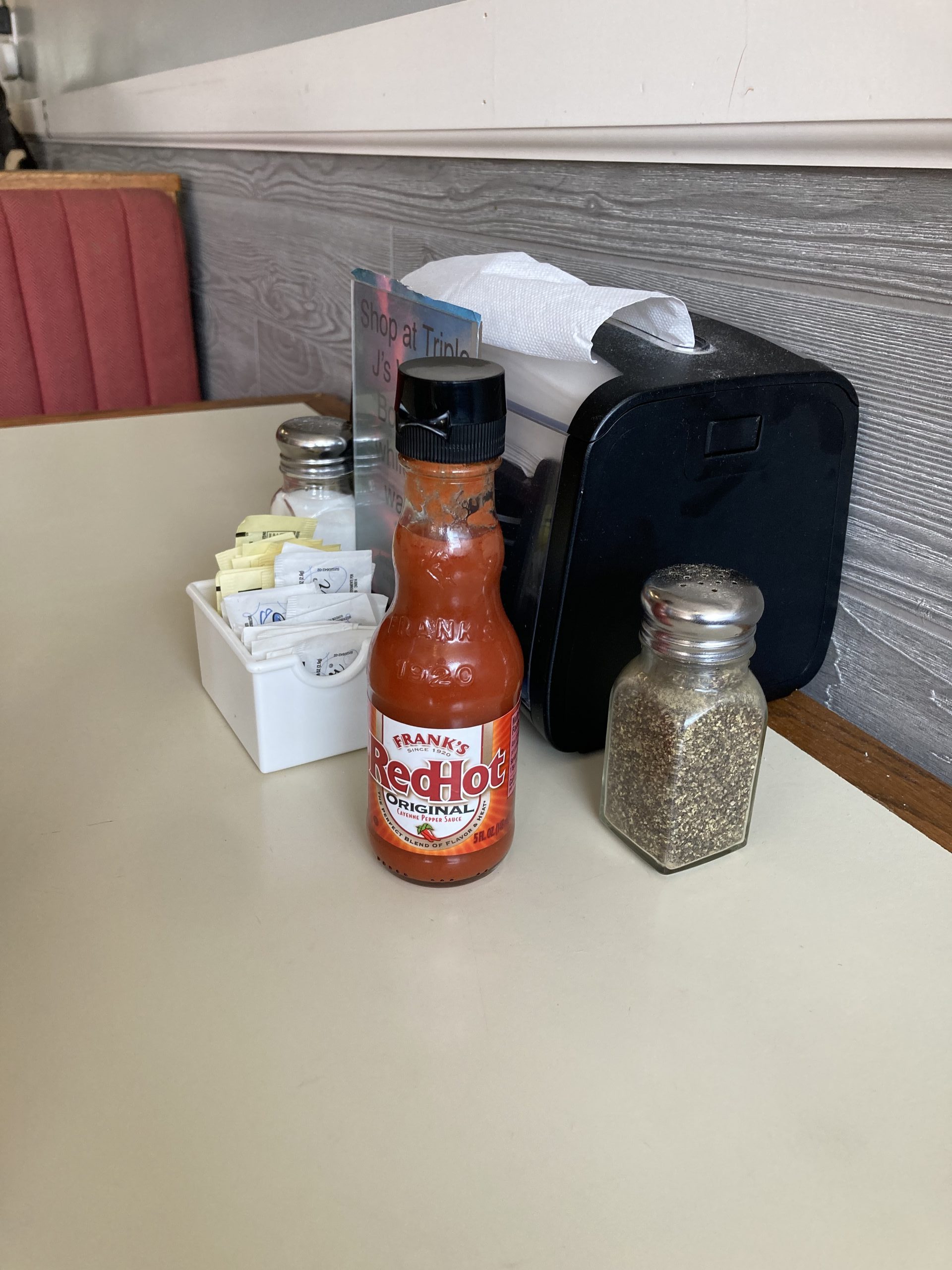 As is my wont when I first try a new BBQ place, I picked the pulled pork sandwich as my entree. I generally try that 1st to see if it’s a “real” BBQ joint or just a pretender. My feeling is that if you can’t get a simple pulled pork sandwich right, then there is no sense in going any further. When I ordered the sandwich, I was asked if I wanted “pickles, coleslaw, and sauce”? I’m not a huge fan of coleslaw, so I opted for just the pickles and sauce. I was then told that it included 2 sides. My choices where the baked beans and corn. (I could have had green beans instead of the corn as both where the vegetable of the day.) As you can see in the picture, the sides came in their own separate bowls, which I kind of like. That allowed me to taste each of them by their selves with nothing influencing the taste. The pork was a generous portion, and while it didn’t have a lot of smoke flavor, it was quite tender and tasty. They may have put a bit too much sauce on it for some people’s liking, but I found it very good. The pickles added just the right amount of sourness to the sweetness of the sauce and were crisp and fresh. The corn was a touch bland at first, but I added some salt and pepper, and they were just fine. The real star for me where the baked beans. They were simply wonderful. Great flavor and seasoning, with bits of brisket mixed in and they needed nothing else. it was nice to see that they had hot sauce already on the table though, for those that want a little more kick to their food.