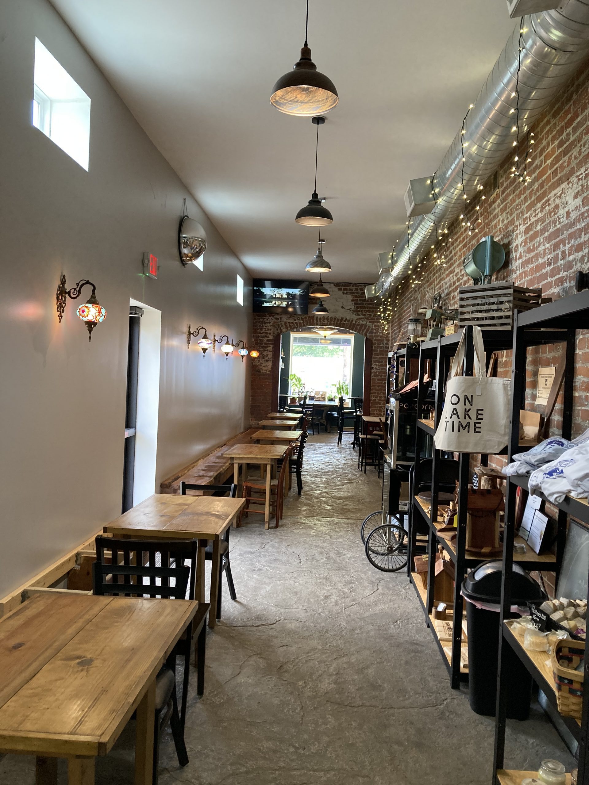 Where there isn’t seating, there are shelves with crafts and other things for sale.
