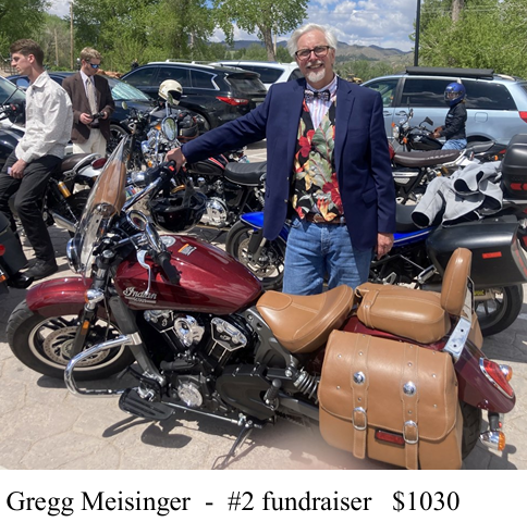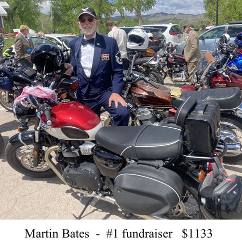 Motorcycle parking was abundant. The café was open for fancy coffees, pastries, Noosa yogurt, and fruit juices. Outside, under the shade trees the DGR folks enjoyed cherry pie pockets, bottled water, and juices courtesy of the Colorado Cherry Company, 1024 Hwy US-34, Loveland, CO (Karen Francis manages the store). As the ride host for DGR and the November Foundation, Ron Francis thanked all the riders for participating and pursuing doners among their family and friends. The 52 riders that registered for the Fort Collins event brought in a total of $6500. The top three fundraisers were recognized: 1st Martin Bates, 2nd Gregg Meisinger, 3rd Doug Logston.
