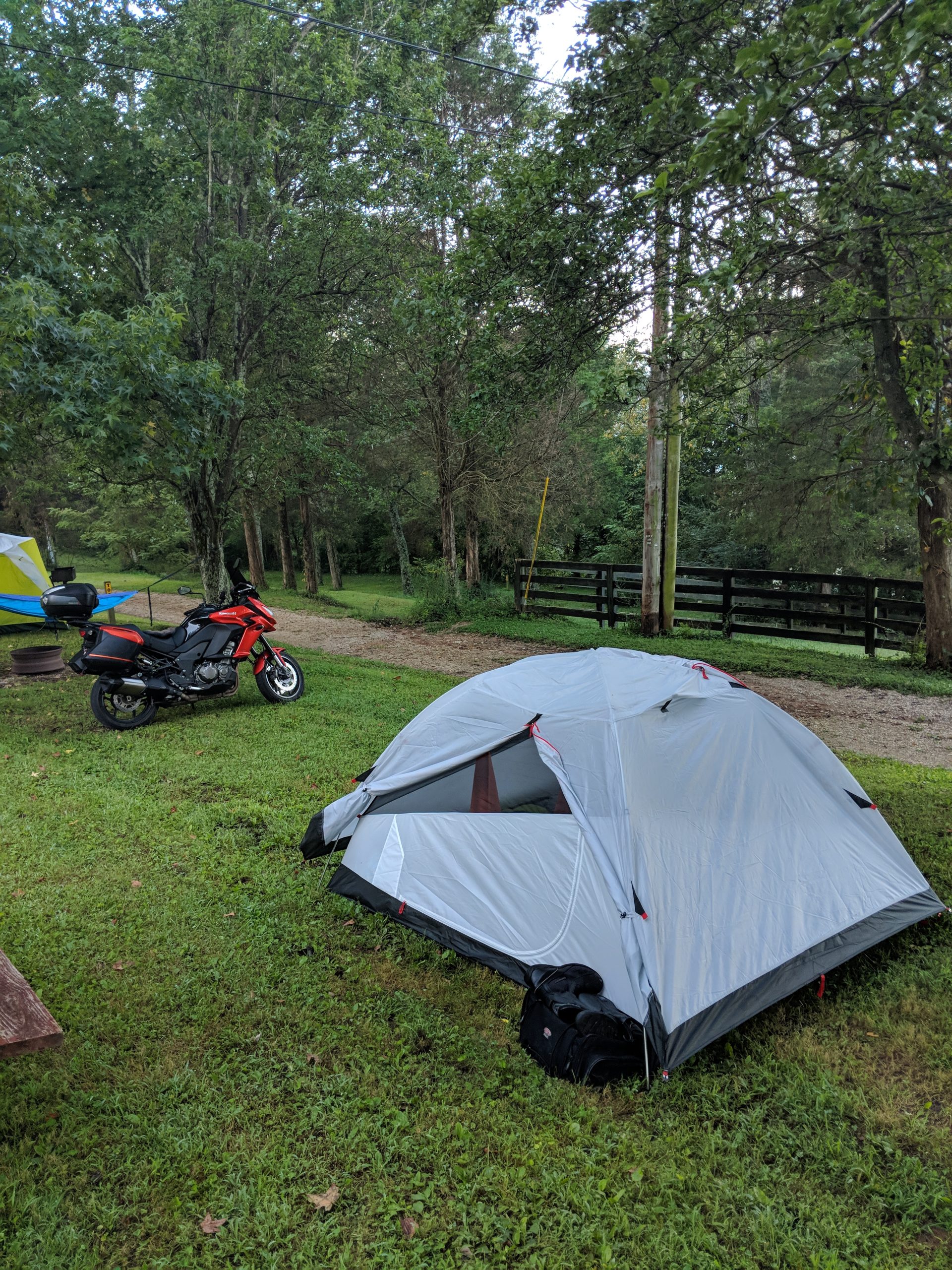 Nothing beats the feeling of riding along on an adventure, not a care in the world. I feel camping adds to this freedom. I love spending the day on the bike, enjoying everything that riding a motorcycle has to offer. I find that when I camp, the feeling of being on an adventure is stronger. I don’t plan on longer days when camping, I like to ride 250-300 miles and then start to look for my campsite for the evening. I enjoy camping in state parks, with the benefits of toilets and showers, but I have also enjoyed just rolling into the forest and setting up camp. It just depends on the rider’s needs and the bike you are riding. If I am on my Versys I try to stay on