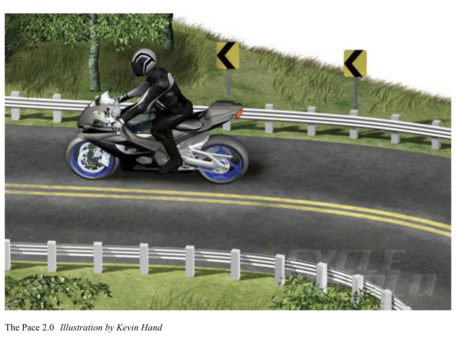The Pace 2.0 needs you to understand the formula Radius = mph (and mph = Radius), and not just in theory. You need to feel it. Find an empty parking lot and ride in a circle at a given lean angle, one that you’re comfortable with. Pick this lean angle, and then gently accelerate while doing your best to hold that very same lean angle. Then do it again and gently decelerate, again holding the same lean angle. Increase your speed and your radius increases, slow your speed and your radius decreases. Steady throttle holds it. After this exercise, you’ll realize how insane it is that some new riders are being taught to increase throttle and push on the inside handlebar if they enter a corner too fast.