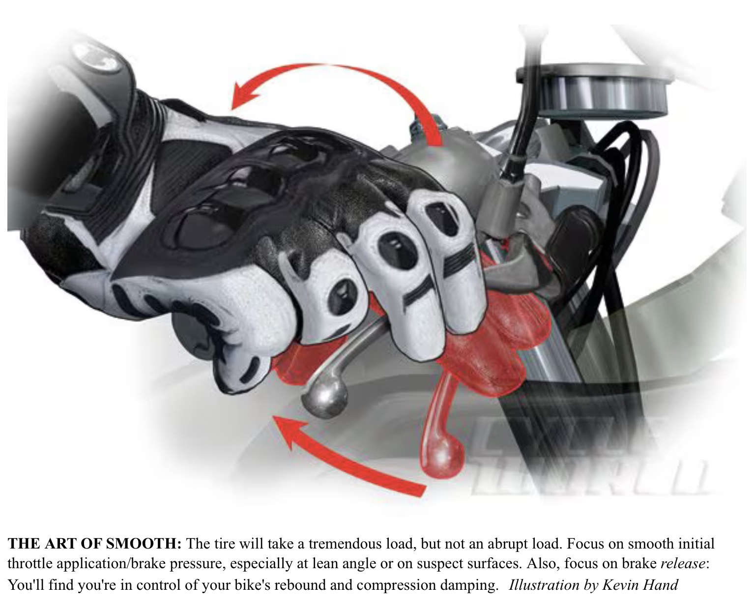 Imagine coming into a corner on the brakes: Your front contact patch is expanded and you’re on the #2 tire, lots of rubber on the road. But before you turn into the corner, you jump off the brakes, the fork springs rebound and suddenly you’re on the #1 tire. And then you ask that tire to take a cornering load! Leaving a bit of brake pressure on at the turn-in point will give you more rubber on the road. It’s called trail-braking and you need to do it to win championships or ride your chosen pace all your life. You’re trailing off brake pressure as you add lean angle, trading “braking points” for “lean-angle points.” And riding on the #2 tire is faster and safer.