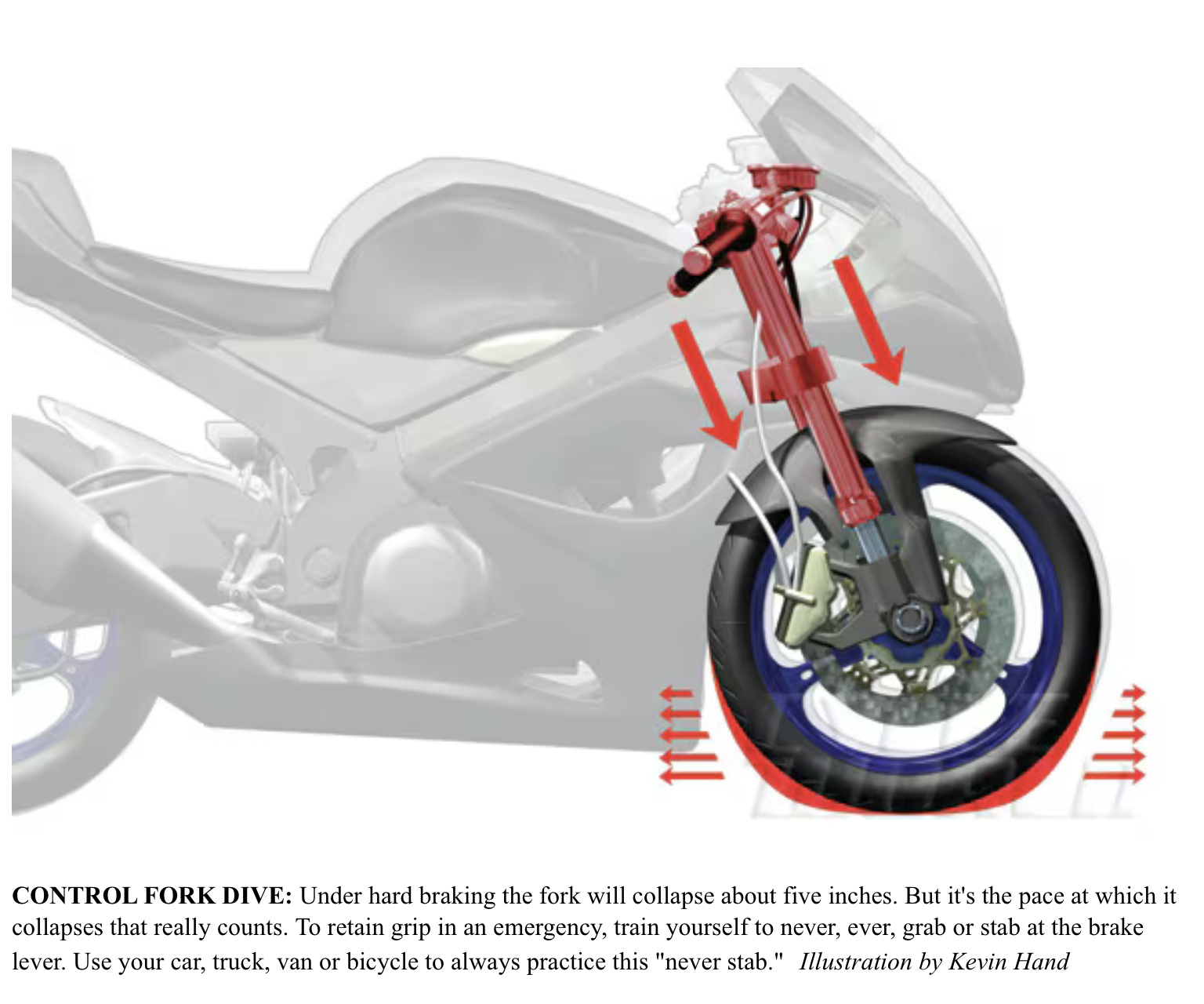 For those who say their bike stands up in the corner when they brake, this is almost always a result of too much initial lever force, which bottoms the fork and flattens the tire (and its contact patch) too abruptly, upsetting the bike. This sport is more subtle than these riders understand.