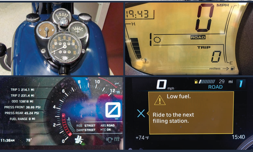 Motorcycle fuel gauges are a recent motorcycle development, though cars have had them since 1922. So technology isn’t the problem per se; it’s the amount of attention the bike requires from us riders.
