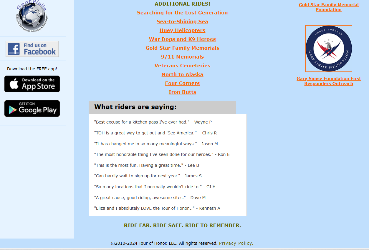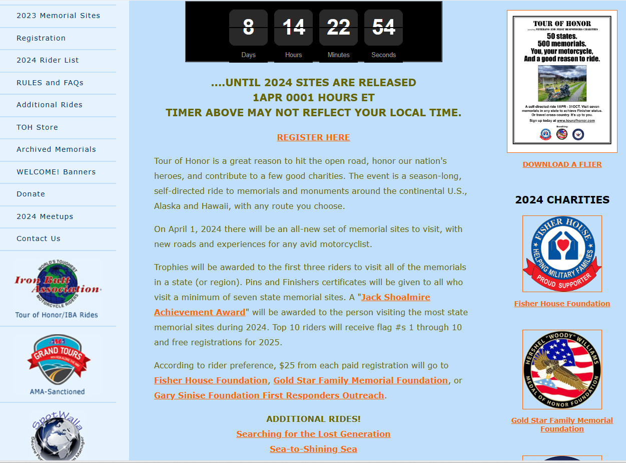 This started about a year or so ago when I saw some posts on Facebook by a friend of mine regarding him doing Tour of Honor rides. Now he is an Iron Butt rider and I just kind of figured that these rides he was doing had something to do with that, but that assumption was incorrect. Then, over this winter, I got a few unsolicited emails and post suggestions that also mentioned the Tour of Honor. My curiosity was piqued, and I needed to find out more. Goggle being my go-to in cases like this, I used the app to find out what this all about. upon entering the words tour, honor, motorcycle, and ride into Google it immediately hit upon the website,