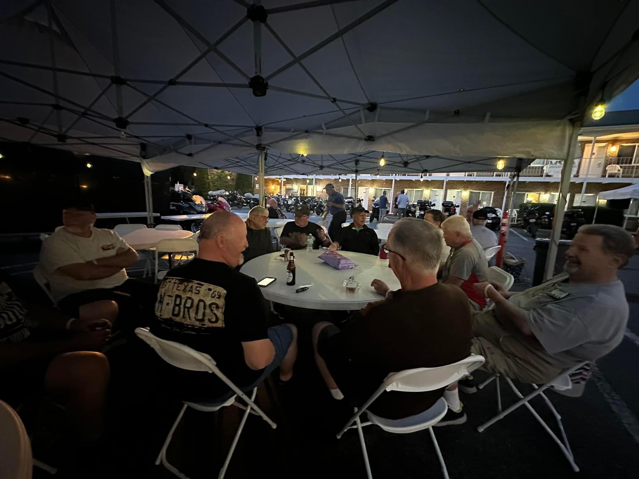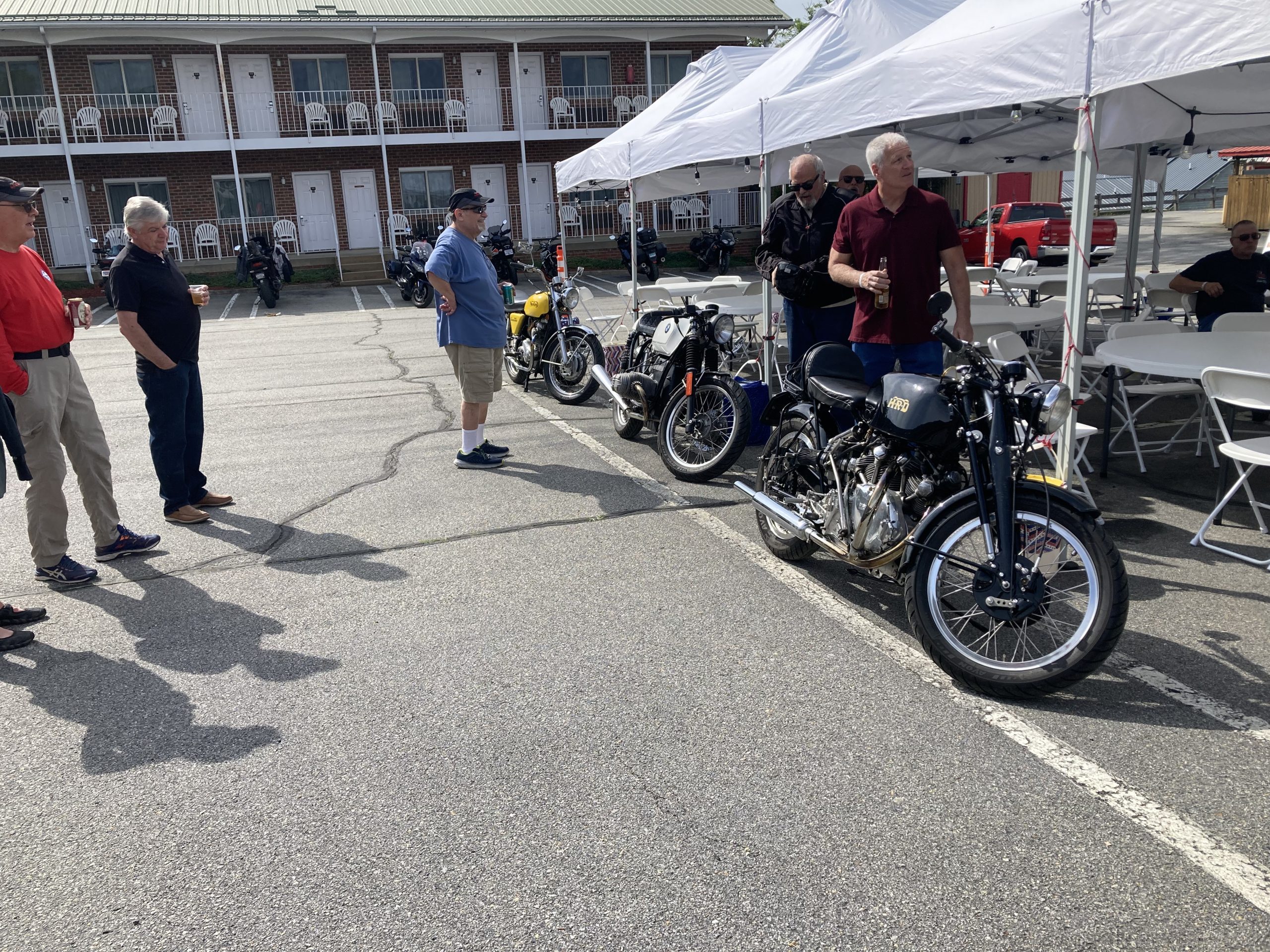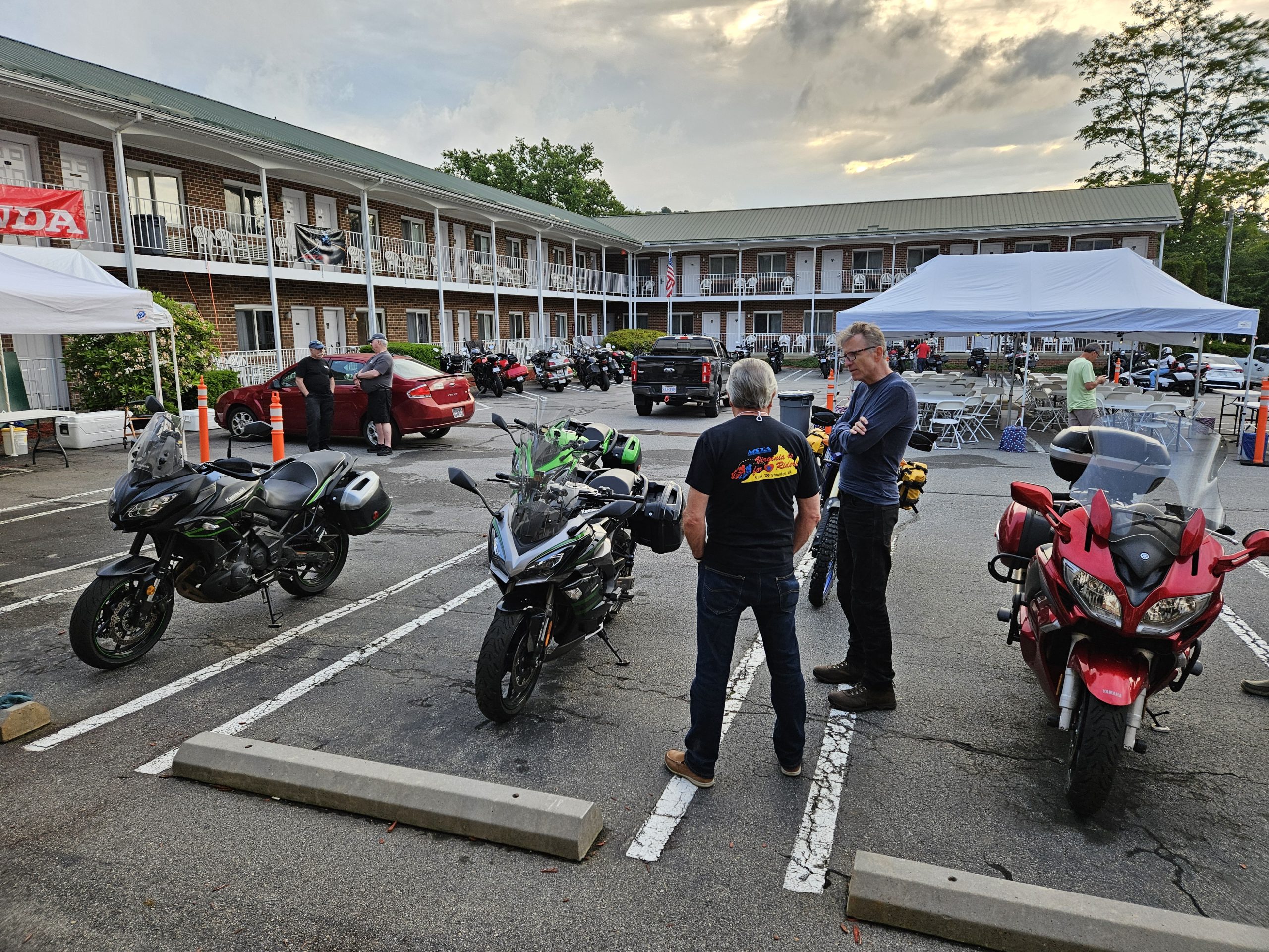 The day started off bright and sunny with temps in the 65–75-degree range for most of the morning. We made our way through Mt. Airy and hopped on the Blueridge Parkway for a short period up to Tuggles Gap. I had been to the store several times in the past, but it had been about 8-10 since my last stop. When we got there, we found the Inn still operating but that the restaurant/store/ and gas pumps were no longer open. The new owner provides breakfast to people staying in the Inn but doesn’t operate the other things anymore. A causality of covid and the lack of help in the workforce was his explanation. Rats! He suggested that we try the nearby town of Floyd, Va. for lunch. About 5 miles north of Tuggles Gap we came into Floyd and found it to be overrun with tourists and traffic to a point where movement was severely constrained. We did stop for gas, but decided to get out of town as quickly as we could. Lunch would have to wait. So up through Indian valley we did head. Eventually, as we headed mostly west through this area, we came to a Shell station just east of I-77. There we found the Grabowski Brothers, Steve and Rich, taking a break and grabbing a cool drink. We pulled in besides them and parked our bikes. At this point it was mid-afternoon and we had about 40 miles lying between us and Sparta. A quick glance at the radar on my phone showed several popup type storms between here and there. Some of which looked quite heavy. Taking a chance, none of us put any rain gear on. Something we would regret quickly. You guessed it, not a mile further down the road it began to rain heavily. Having learned our lesson on the ride down to the rally the prior Wednesday, we pulled off at the next little road intersection and Luis and Mike donned their rain gear. I put my rain jacket on but not the pants. We dodged in and out of lighter showers for the next 30 miles until we reached Independence. In the mountains it can be raining on one side of a hill and be totally dry on the other, and this was no exception. The roads from there to Sparta were completely dry. The little bit of rain we got actually felt good as it cooled us, and the air around us, down to quite comfortable temperatures. We got back to the hotel, where I grabbed a nice shower and an even better nap, before the evening festivities began. A great day of riding!
