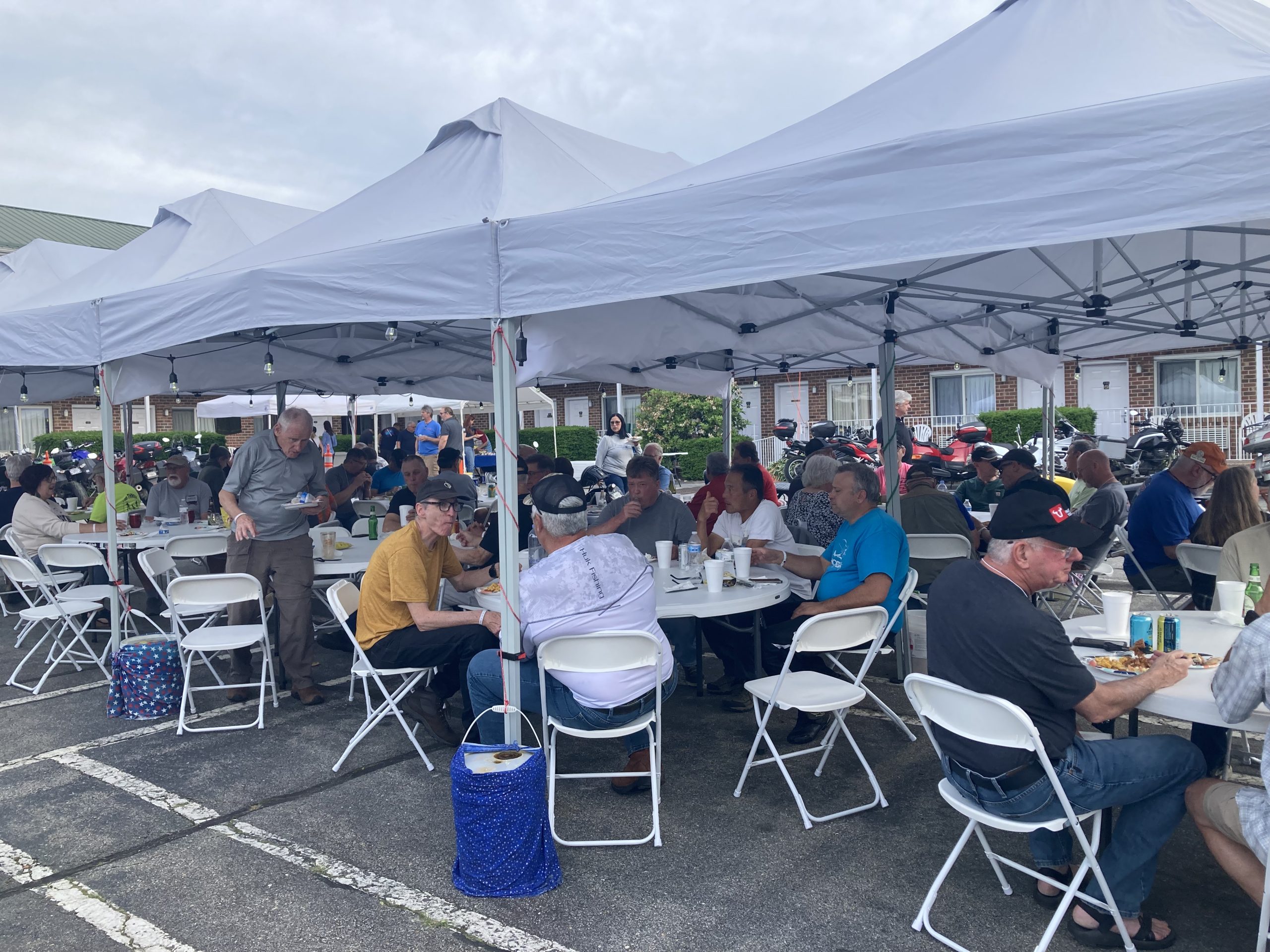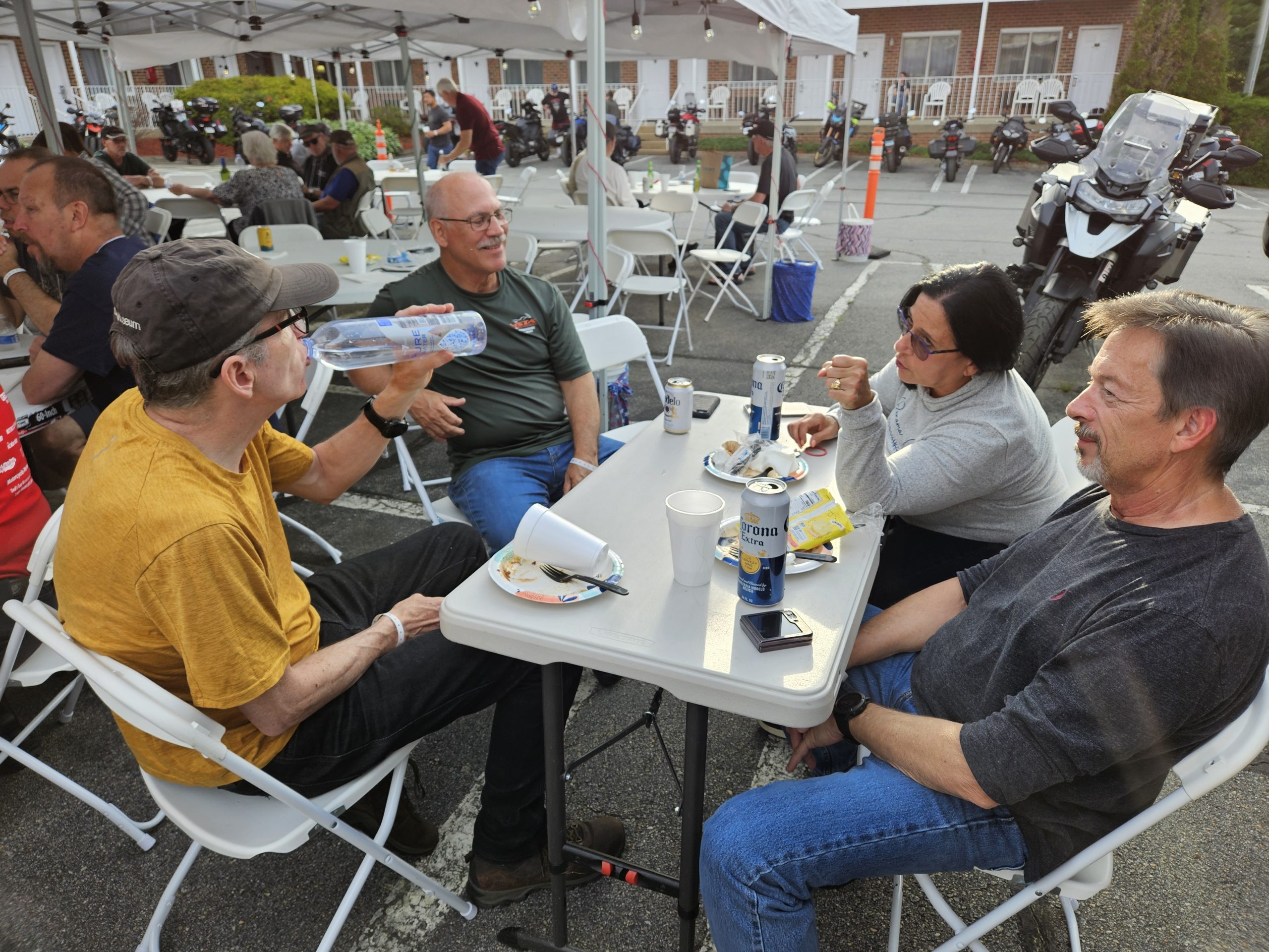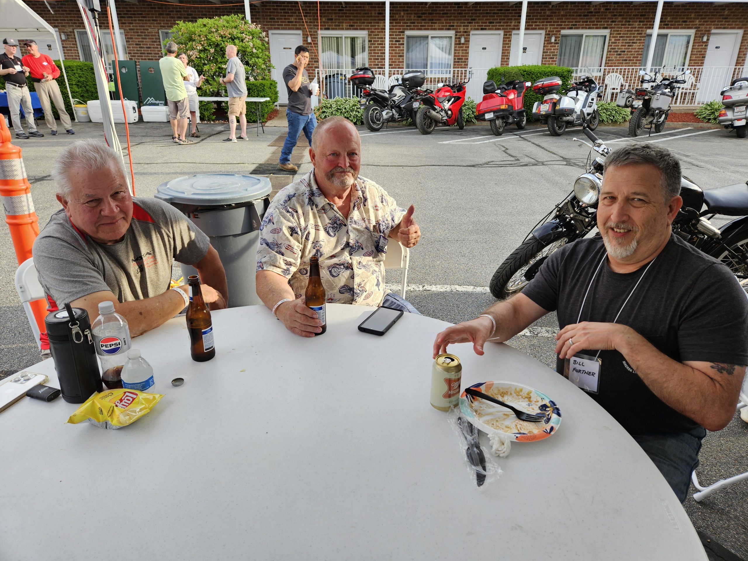 The day started off bright and sunny with temps in the 65–75-degree range for most of the morning. We made our way through Mt. Airy and hopped on the Blueridge Parkway for a short period up to Tuggles Gap. I had been to the store several times in the past, but it had been about 8-10 since my last stop. When we got there, we found the Inn still operating but that the restaurant/store/ and gas pumps were no longer open. The new owner provides breakfast to people staying in the Inn but doesn’t operate the other things anymore. A causality of covid and the lack of help in the workforce was his explanation. Rats! He suggested that we try the nearby town of Floyd, Va. for lunch. About 5 miles north of Tuggles Gap we came into Floyd and found it to be overrun with tourists and traffic to a point where movement was severely constrained. We did stop for gas, but decided to get out of town as quickly as we could. Lunch would have to wait. So up through Indian valley we did head. Eventually, as we headed mostly west through this area, we came to a Shell station just east of I-77. There we found the Grabowski Brothers, Steve and Rich, taking a break and grabbing a cool drink. We pulled in besides them and parked our bikes. At this point it was mid-afternoon and we had about 40 miles lying between us and Sparta. A quick glance at the radar on my phone showed several popup type storms between here and there. Some of which looked quite heavy. Taking a chance, none of us put any rain gear on. Something we would regret quickly. You guessed it, not a mile further down the road it began to rain heavily. Having learned our lesson on the ride down to the rally the prior Wednesday, we pulled off at the next little road intersection and Luis and Mike donned their rain gear. I put my rain jacket on but not the pants. We dodged in and out of lighter showers for the next 30 miles until we reached Independence. In the mountains it can be raining on one side of a hill and be totally dry on the other, and this was no exception. The roads from there to Sparta were completely dry. The little bit of rain we got actually felt good as it cooled us, and the air around us, down to quite comfortable temperatures. We got back to the hotel, where I grabbed a nice shower and an even better nap, before the evening festivities began. A great day of riding!