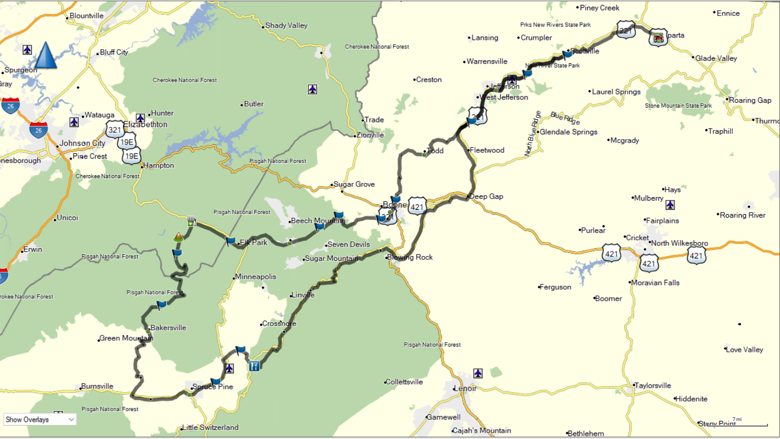 While at lunch we discussed our return route to the hotel in Sparta and decided that because of the time that we might want to cut the original route short. We didn’t want to get caught in any Friday afternoon traffic around the tourist towns of Blowing Rock and Boone, so we opted to jump n the Bluegrass Parkway and head north as far as we could. We had been warned that there was a bridge out just south of where the parkway passes Sparta, so we knew that we would have to find an alternative when we ran into that detour. We stayed on the parkway all the way to just south of Jefferson and West Jefferson and then got off. By then we were all in need of fuel, with a couple of us running on reserve. No problem though as we gassed up in West Jeff and then caught 221 (one of my favs) back to Sparta.