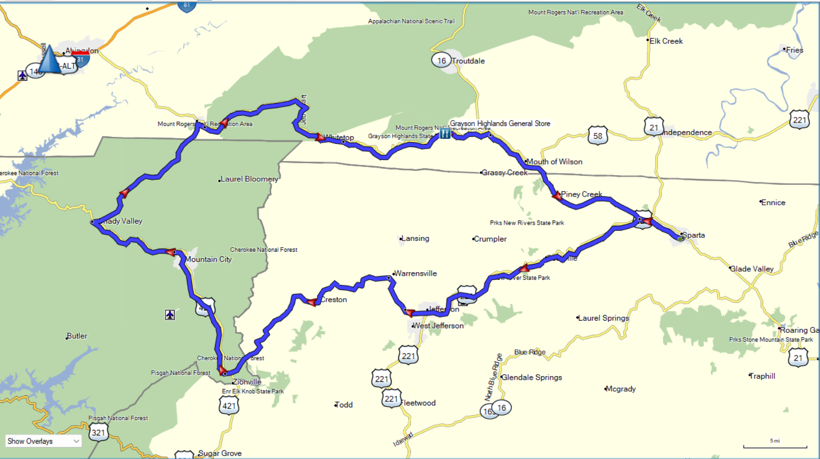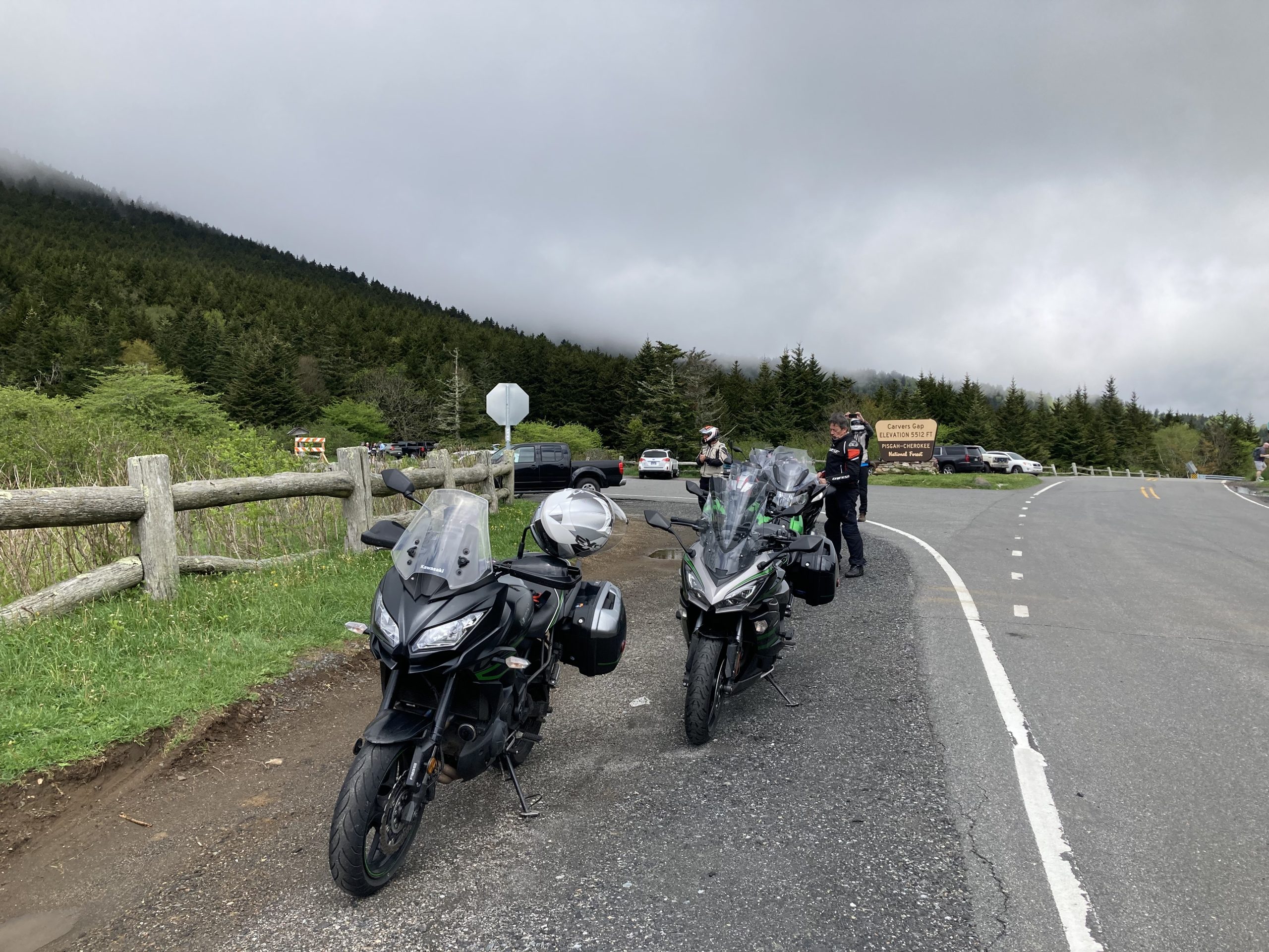 The weather forecast for Thursday was for sunny skies with temps in the 70’s for most of the day. There was a chance of rain coming in mid-afternoon or evening, but not a definite thing for sure and good chance that the whole day would be dry. Quite an improvement over what had been originally forecasted. It had rained overnight, and the roads were still wet in places. After a hardy breakfast at the restaurant in the parking lot, five of us saddled up and headed out for a 200-mile route. Luis, Mike, and I were joined by Kenny from Maryland and Brenden from Ohio. Our route would include some favorite roads over to Mountain City, TN (221 and 88), then a run through the southern part of 421 (AKA The Snake), 133 over to Damascus, Va, then 58 back over Whitetop and finally 93 to Sparta. The last leg of the trip would mirror our previous night’s adventure, but hopefully without the rain, thunder, and lightning we had experienced previously. (For a complete story of that expereince see You Meet the Nicest People…) We started off on 221 taking it easy as there was still some dampness on the road, our tires were cold, and there was fog hanging in the air. By the time we made it over past West Jefferson and hit 88 we started to push a little more.