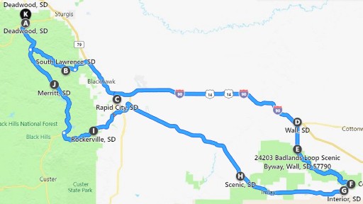 Take a look at this recommended Badlands route on Bing Maps. From Deadwood head out through the eastern side of the Black Hills National Forest past Rapid City and onto Wall South Dakota. The many signs leading to the Wall Drug Store are hard to miss. Drop in for lunch or a late breakfast. Or try one of the many local restaurants on Main Street. From Wall, take the Badlands Scenic Loop Byway into and through Badlands National Park. Be aware the park requires a $25 entrance fee per motorcycle. About three quarters of the way through the park, we suggest exiting at the junction with SD Highway 377. For those who want to experience the last 25% of Badlands Loop, just make a U-turn back to the SD-377 junction. SD-377 leads back to the Black Hills National Forest through what seem like endless grasslands. The day wraps-up with a scenic ride through the Black Hills and returns to Deadwood just in time for dinner.
