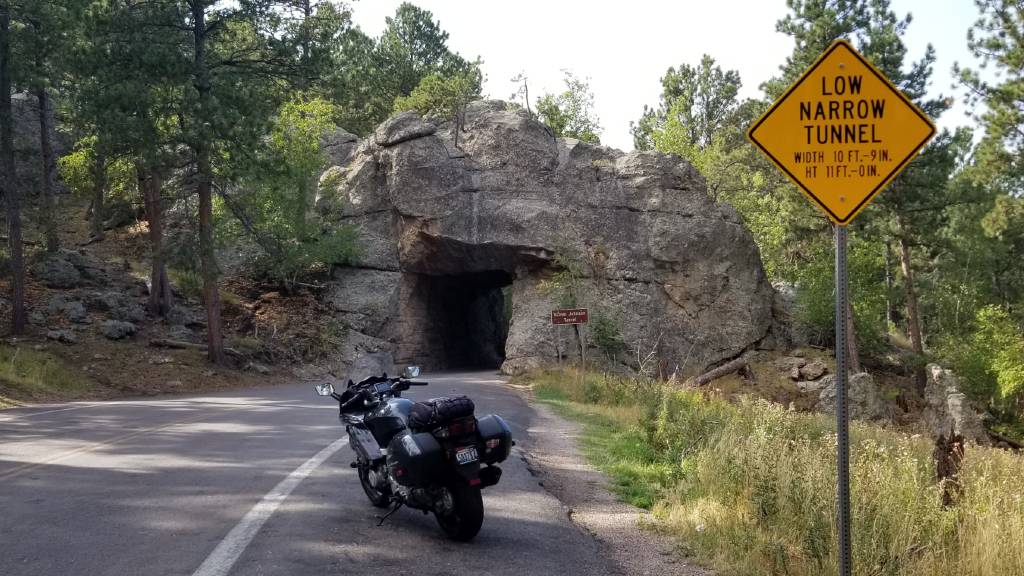 Check out the suggested Rushmore route on Bing Maps. It travels south on US-85 & US-385 to Hill City SD, and from there into Custer National Park and eventually turns onto Needles Highway (SD-87). Needles is the first of two technical roads on this ride. Although less technical than Iron Mountain Road, it doesn’t disappoint. Be aware that this route runs through Custer State Park so a fee of $20 is required at the Sylvan Lake park entrance. It’s worth it. You’ll ride through mountain forests, pass striking rock formations and in some cases take one-lane tunnels right through them. And end to end the tight turns are seemingly endless.