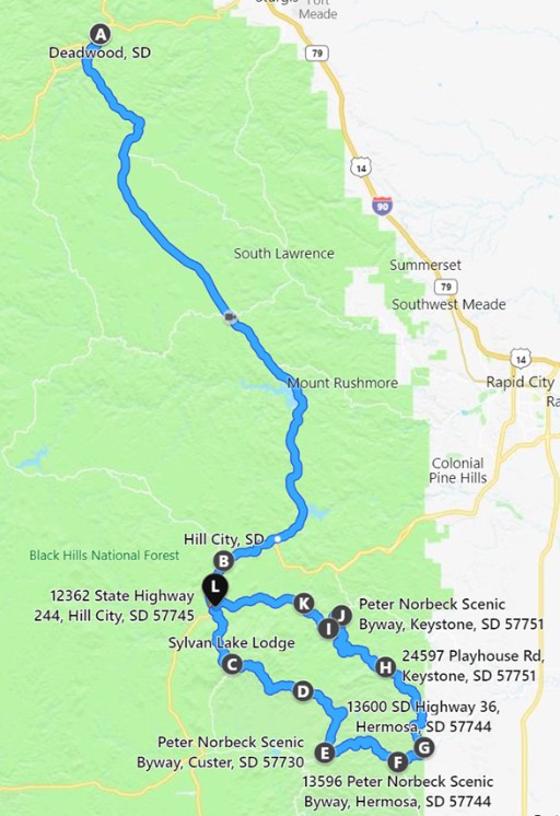 Definitely not the shortest route by any means but certainly delivers the most smiles per mile. All told plan to ride roughly 150 miles and allow about four and a half hours of riding time. Add more time to enjoy Mount Rushmore and the many vistas along the way.