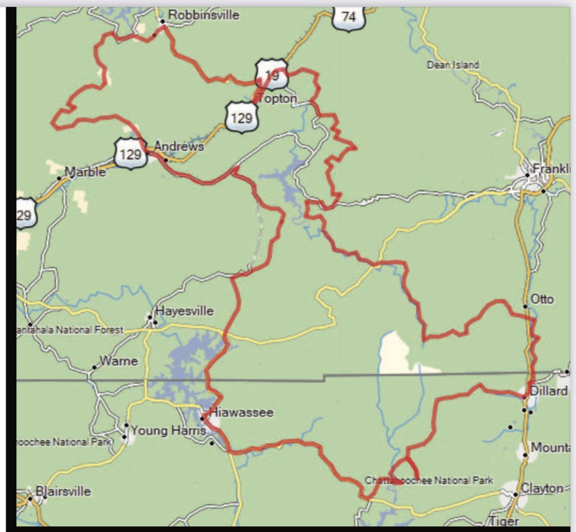 getting only to about forty degrees. Weather was still cold and breezy with a high temperature of only 50 degrees. We waited until 11 am to start -the temperature was still a little under 40, but the sunny clear sky helped a lot! Due to the late start, we ran a short 85-mile route that went east from Dillard and included parts of North and South Carolina.