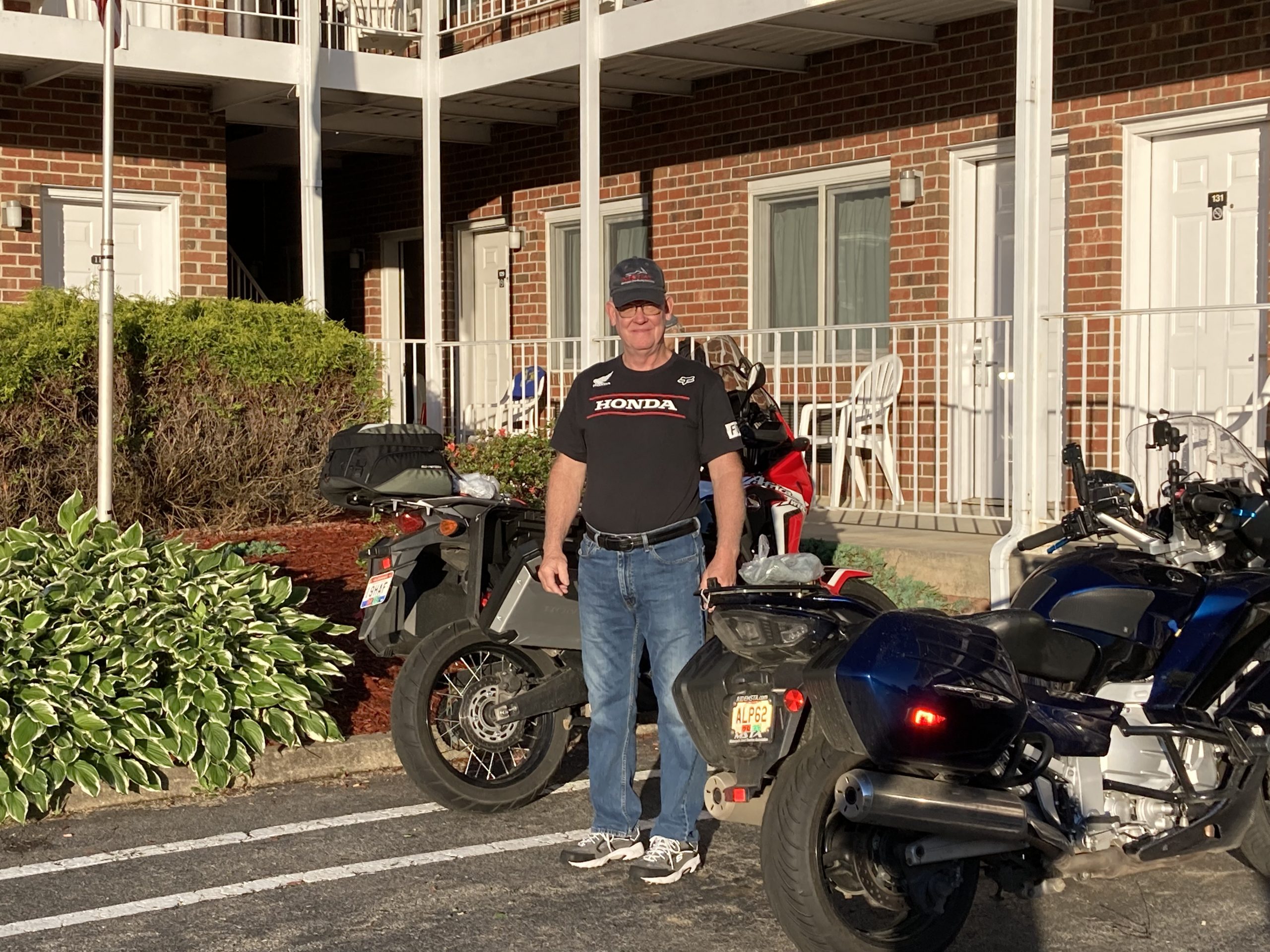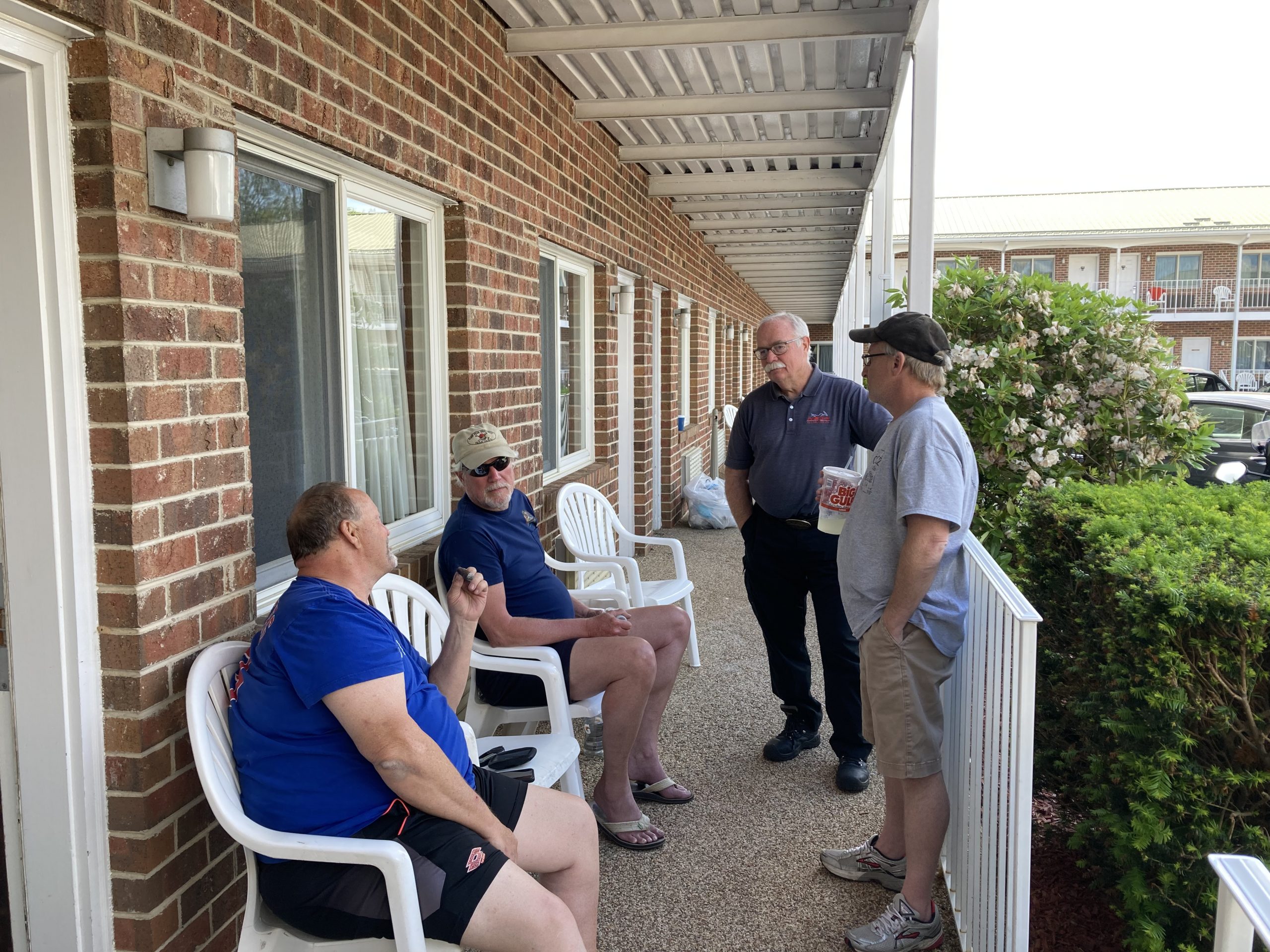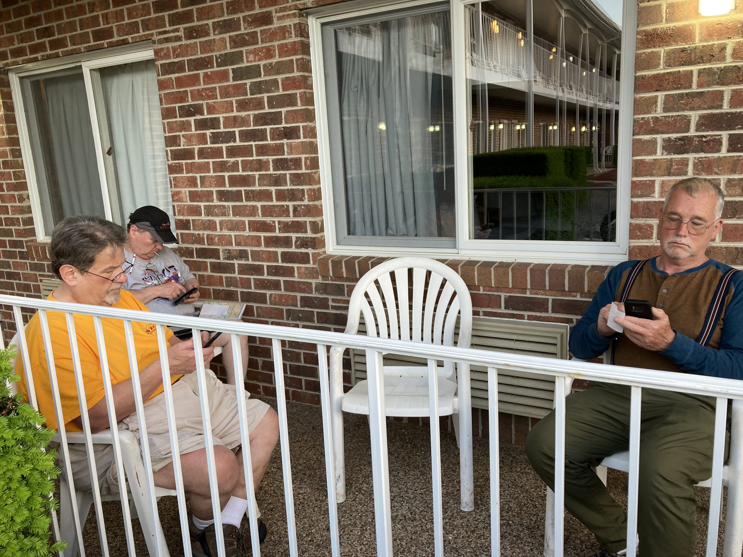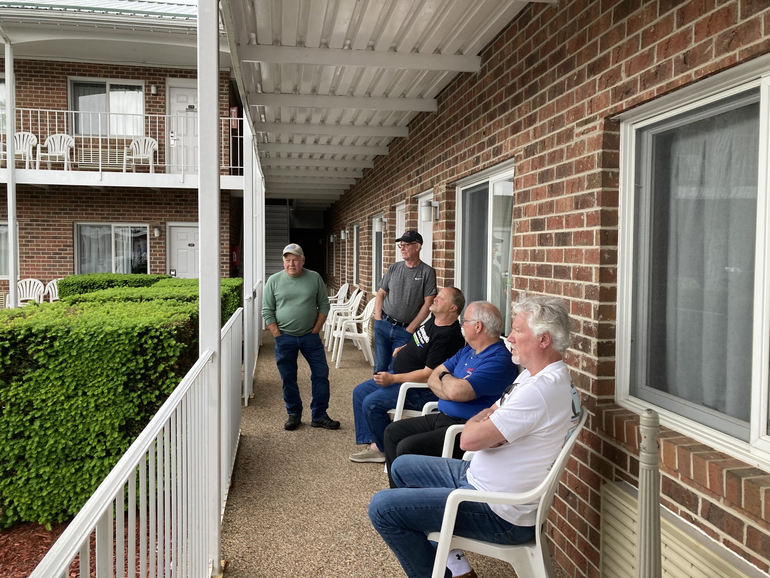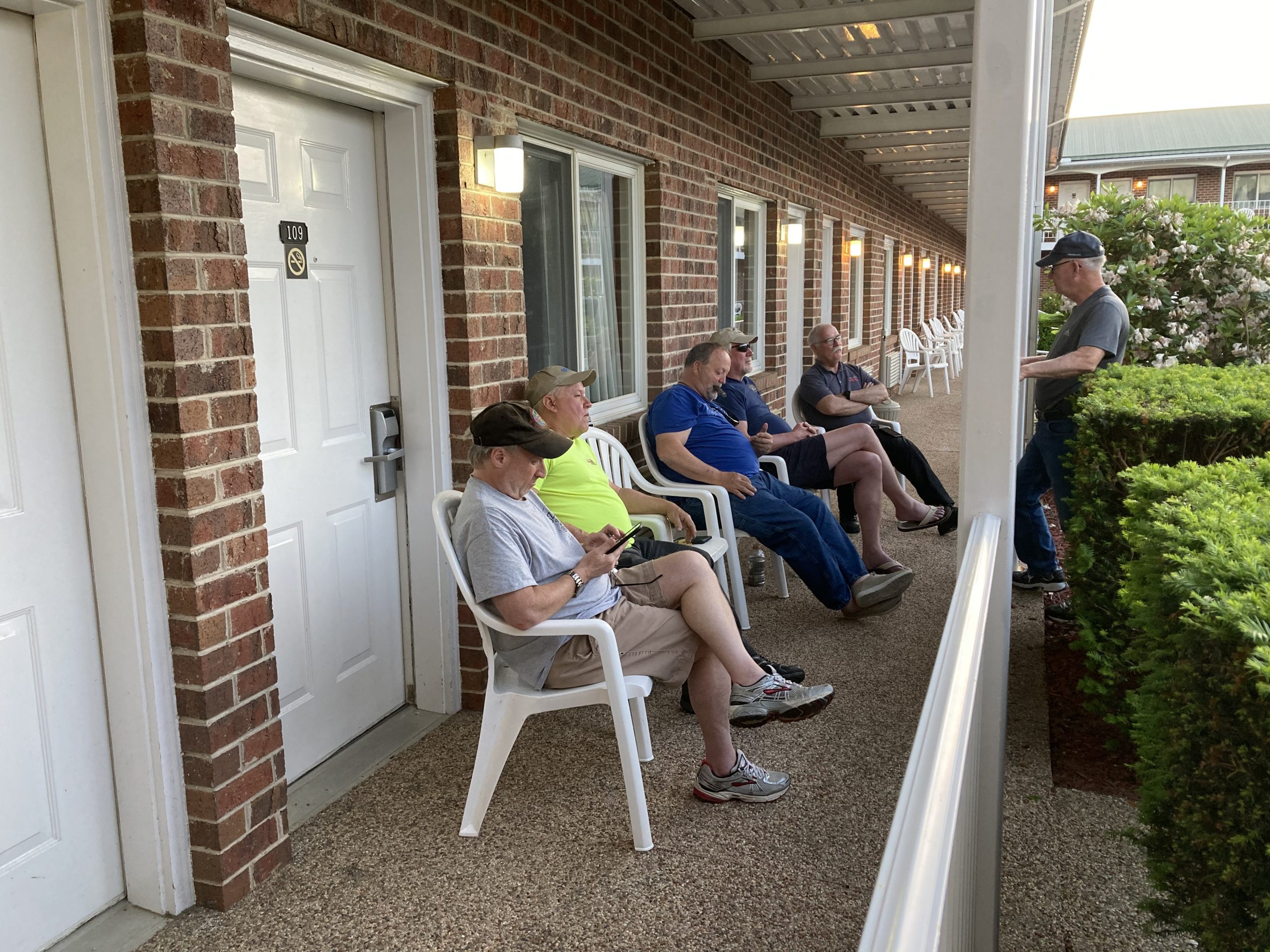 After dinner we, and others that had chosen to eat elsewhere or had arrived while we were eating, did what comes naturally to all of us. We sat out in the chairs on the porch or walked around the parking lot and told stories, looked at bikes, and generally did what we call “tire kicking”. No tires were harmed in this processes, but it may have resulted in a few headaches in the morning.
