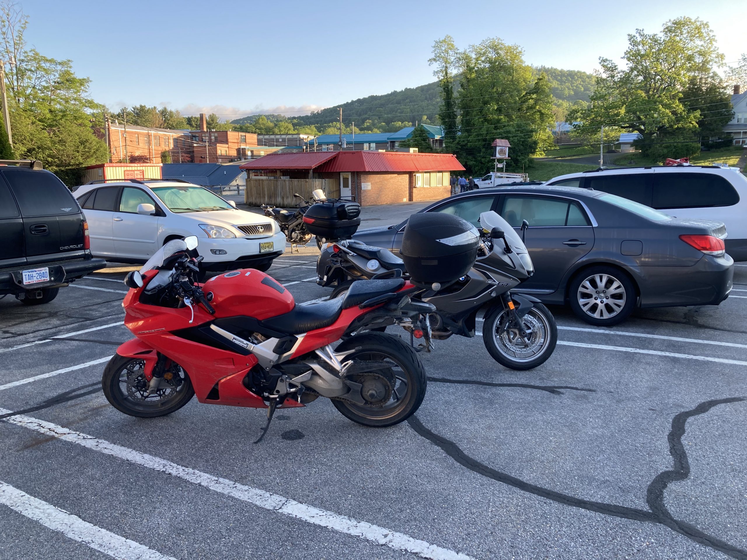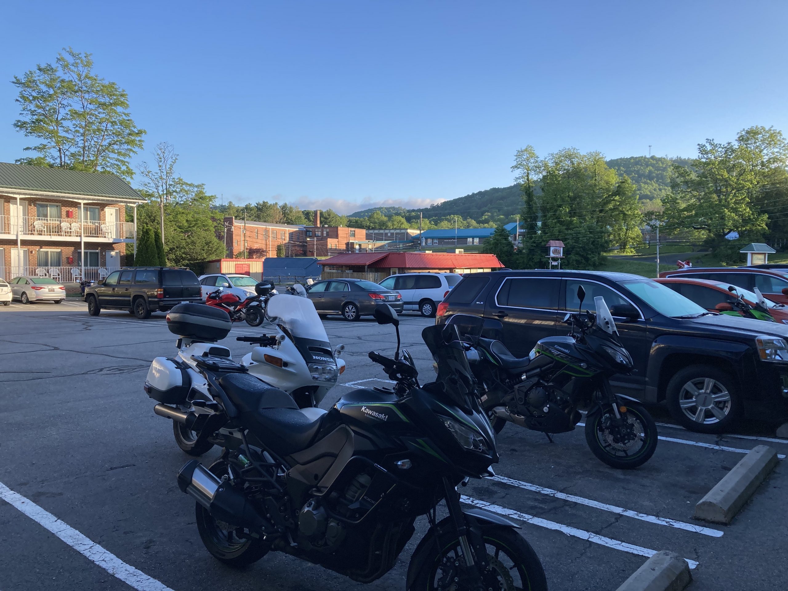 A promising start! We took off heading straight south for the 1st 80-90 miles, heading to the Mountain Parkway which would take us in our desired southeastern direction. The further south we got, the more blue sky we saw and the dryer the roads. Since it was still a cool morning, I had left my rain gear on to cut the chill. A short time later, I was very happy that I had made that decision. Mark had his rain gear on also. This would soon turn out to a wise choice for both of us. After we turned on the Parkway we almost immediately went through a very hard and intense rain for about 2 minutes. I said to Mark (we use Sena communicators) that if that little bit of rain was all we saw then we would be in great shape and this was going to be a fun ride. The sky was pretty clear at this point and there was plenty of reason for optimism. Unfortunately, that didn’t last. By the time we got to Campton, KY the clouds had moved back in and the rain started up again. Not heave, but certainly steady. For the next 3 hours we rode in rain. Deciding that discretion is the better part of valor, we adjusted our planned route and stuck to main roads during that period. By the time we reached Norton, VA the rain had stopped and the sun had actually begun to reappear. it was around 1:30 in the afternoon at this point and we grabbed a quick sandwich at a McDonalds. When we came out of there the temps had risen, the sun was shinning, and we put away the happily put away the rain gear. It was clear sailing over damp roads the rest of the way and we pulled into the hotel in Sparta right about 4. We were met right away by several other members that had either gotten there the day before or arrived earlier in the afternoon. My old friend, Howard Roth, who had come over from Nashville, pulling in right after we got there. He said that he hadn’t seen rain the whole day until he was on NC93, a road that Mark and I had ridden dryly across just a few minutes ahead of him! Weather sure is strange in the mountains.